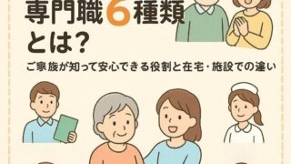 介護 介護に携わる専門職6種類とは?ご家族が知って安心できる役割と在宅・施設での違い 介護にはケアマネジャー・介護福祉士・看護師・リハビリ職など多くの専門職が関わります。本記事ではご家族向けに、6つの専門職の役割と在宅介護・施設介護での違いを分かりやすく解説します。 2025.10.01 介護