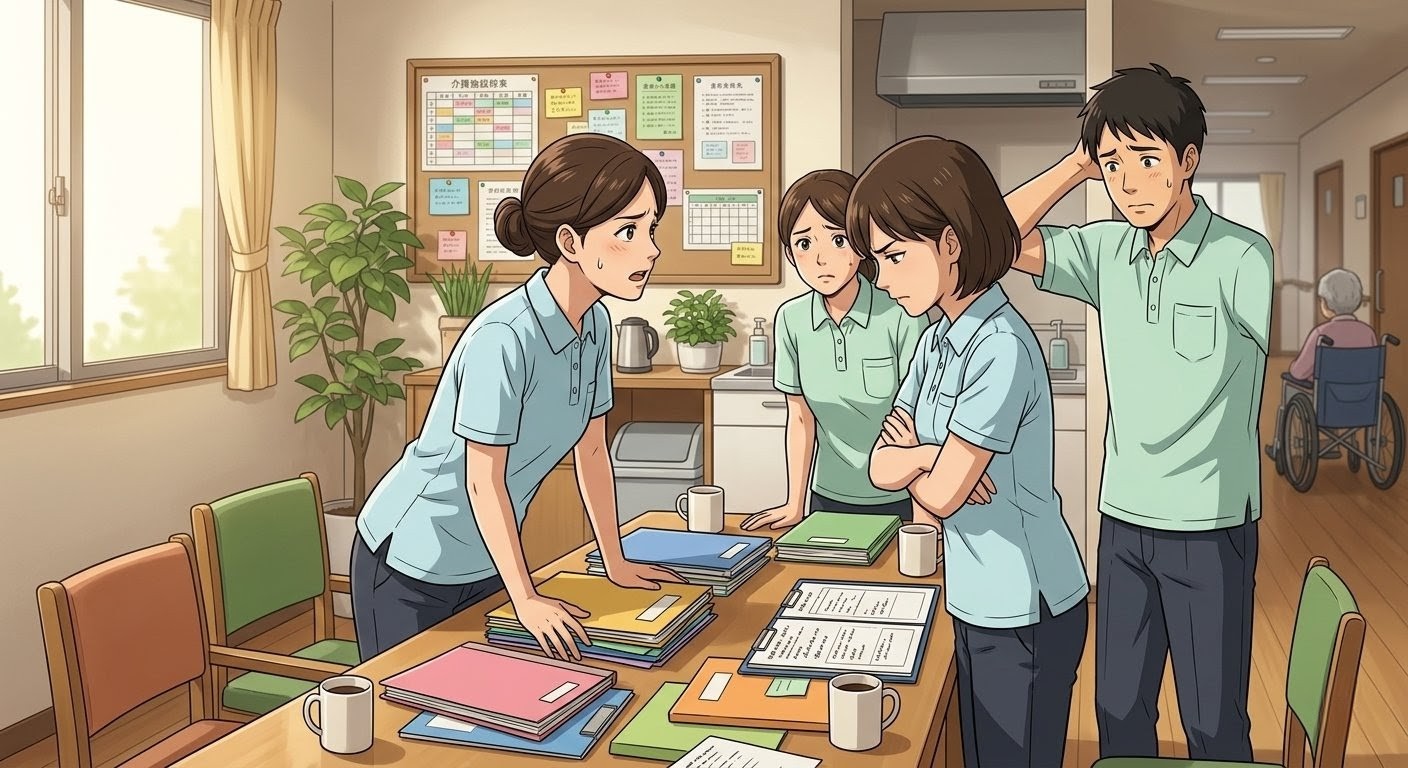 介護現場で職員同士が意見を交わし、緊張した雰囲気になっている様子 介護 介護職