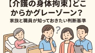介護 【介護の身体拘束】どこからがグレーゾーン?家族と職員が知っておきたい7つの判断基準 介護現場で迷いがちな「身体拘束のグレーゾーン」。本記事では、家族と職員が知っておきたい判断基準、よくある曖昧なケース、誤解を防ぐ説明のコツをわかりやすく解説します。 2026.01.09 介護